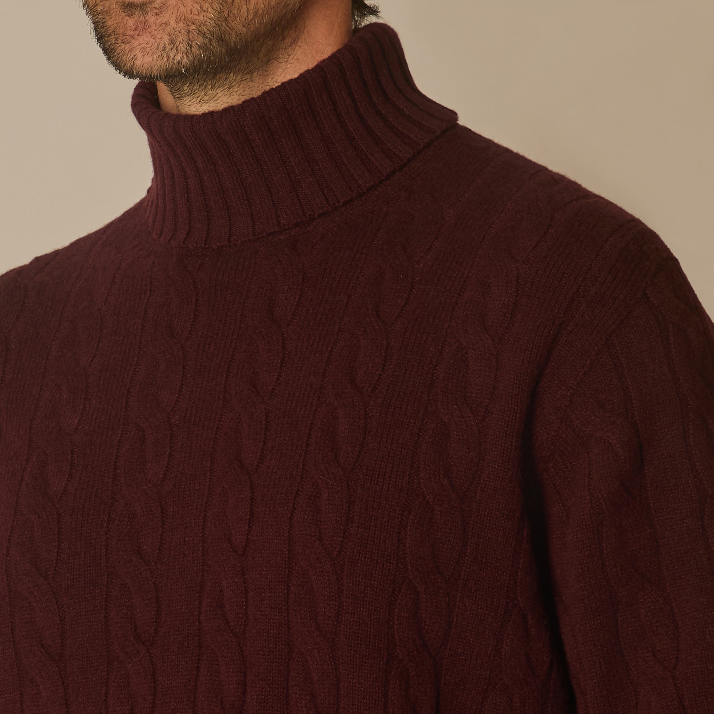 Made in Italy from a luxurious blend of wool and cashmere, this cable knit roll neck jumper in burgundy offers both texture and depth. The intricate cable knit brings a classic touch, while the fine ribbing at the neck, hem, and cuffs adds a refined finish. The roll neck design provides a clean, elongated line, making it a versatile choice for layering under outerwear or pairing with tailored trousers for a more polished look. A timeless knit reimagined with rich colour and exceptional craftsmanship.
