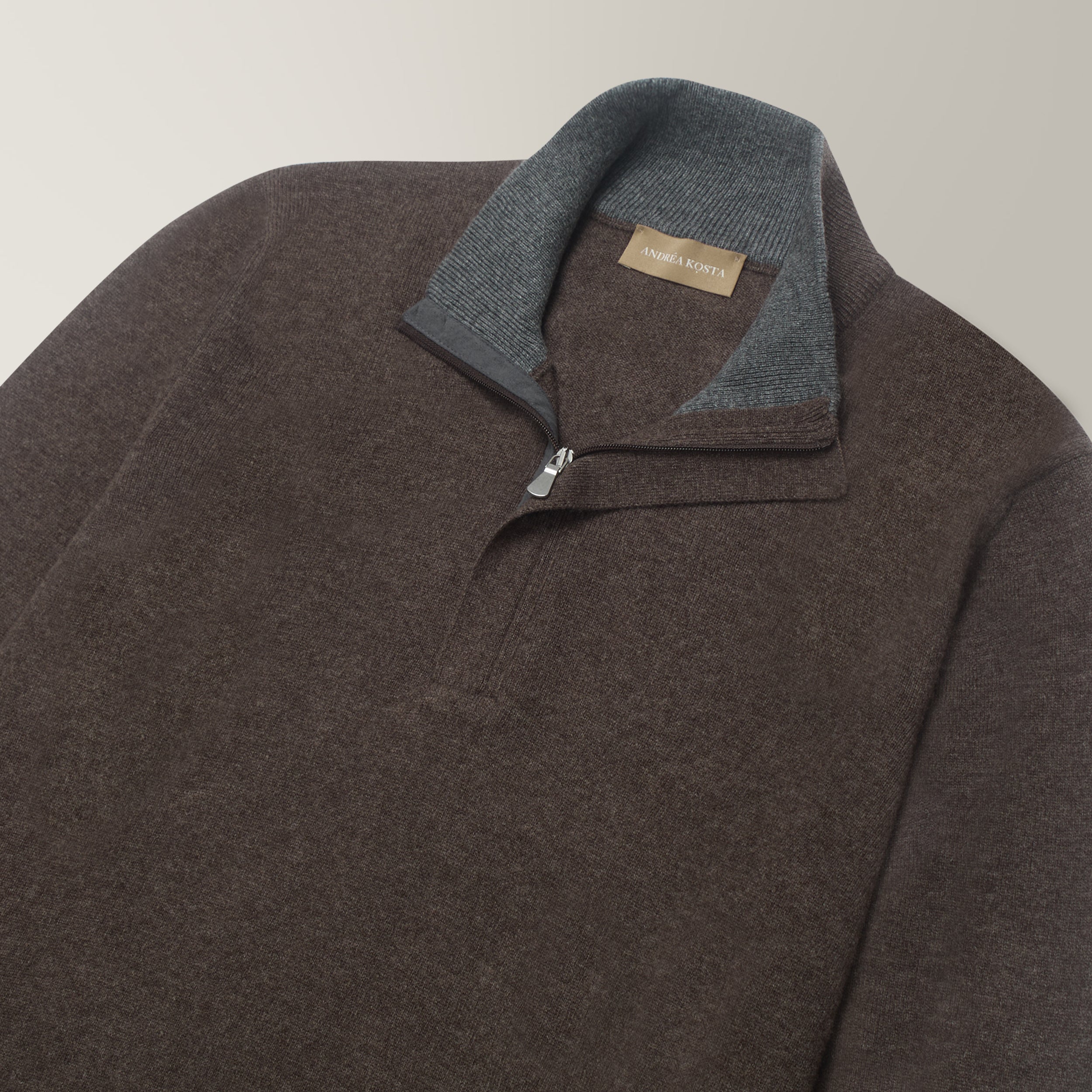 Made in Italy, our Dima quarter zip jumper in brown is crafted from a luxurious blend of virgin wool and cashmere, offering a smooth, refined feel. The design features an Alcantara placket and a sleek quarter-zip fastening for a contemporary finish, while contrast edging along the collar and hem adds subtle detail. A versatile knit that bridges smart and casual dressing with effortless sophistication.