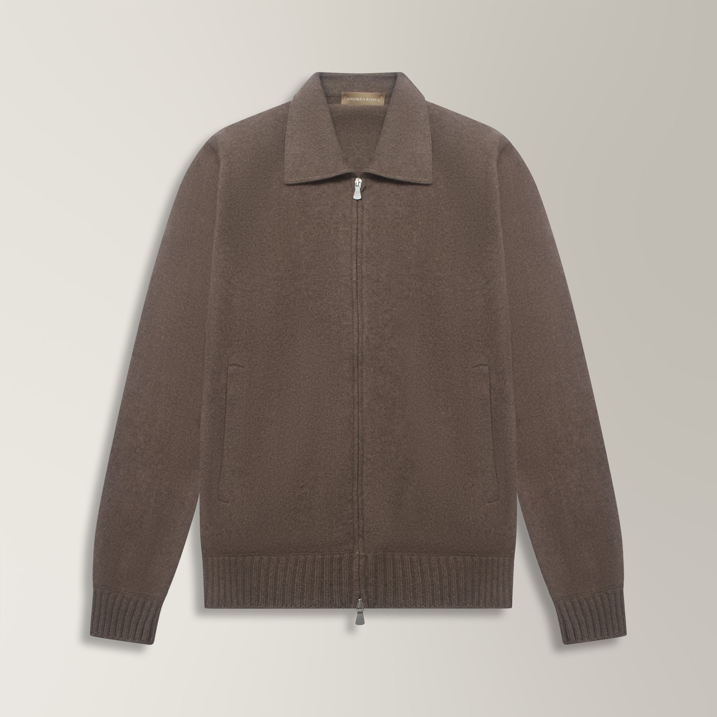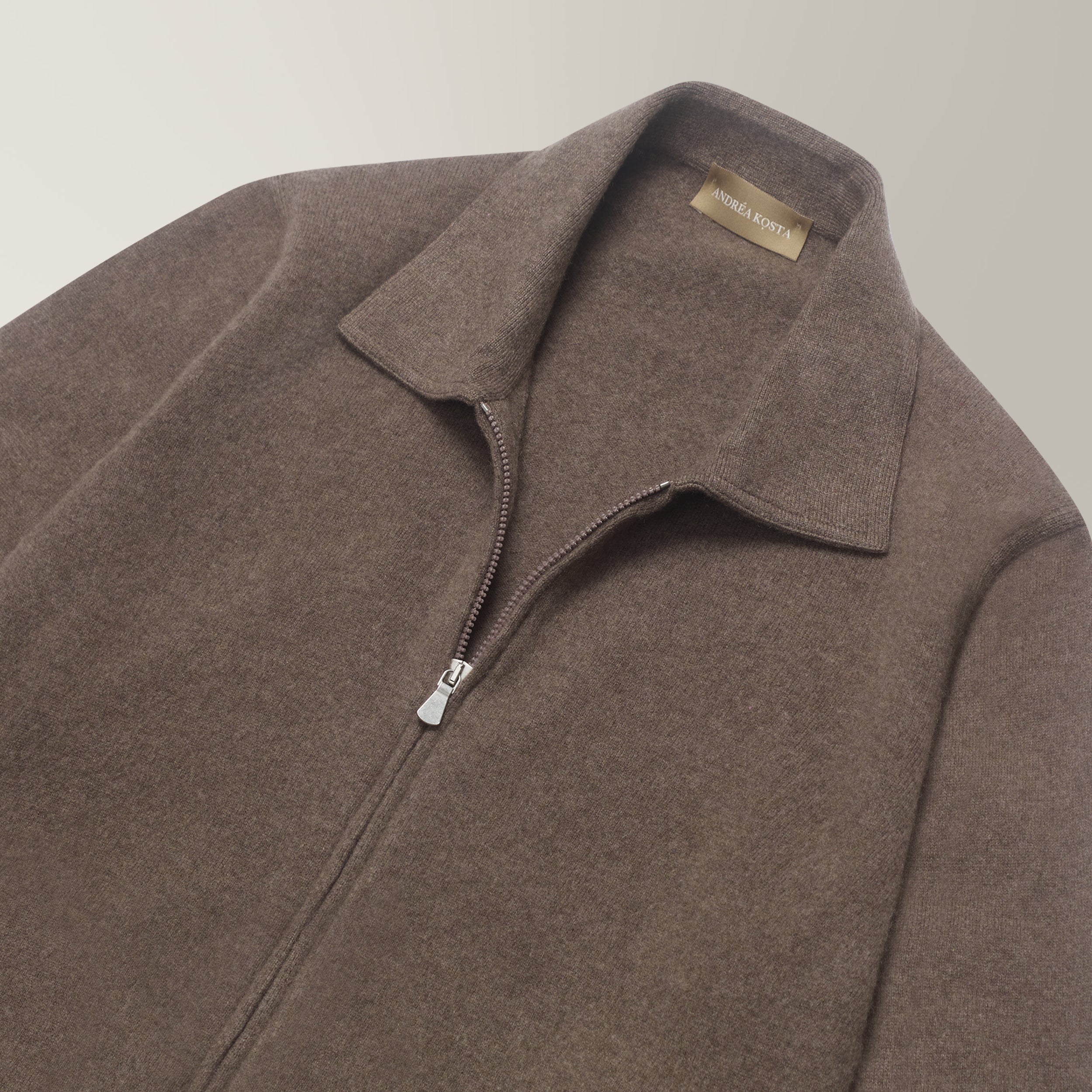 Made in Italy, our Nereo full zip jacket in taupe is crafted from pure cashmere for a refined feel and an effortless drape. Designed with a shirt collar and a sleek double-zip closure, it offers a clean, contemporary silhouette. Ribbed cuffs and hem provide subtle structure, while two welted front pockets add a practical touch. A versatile layer that combines luxury, comfort, and understated sophistication.