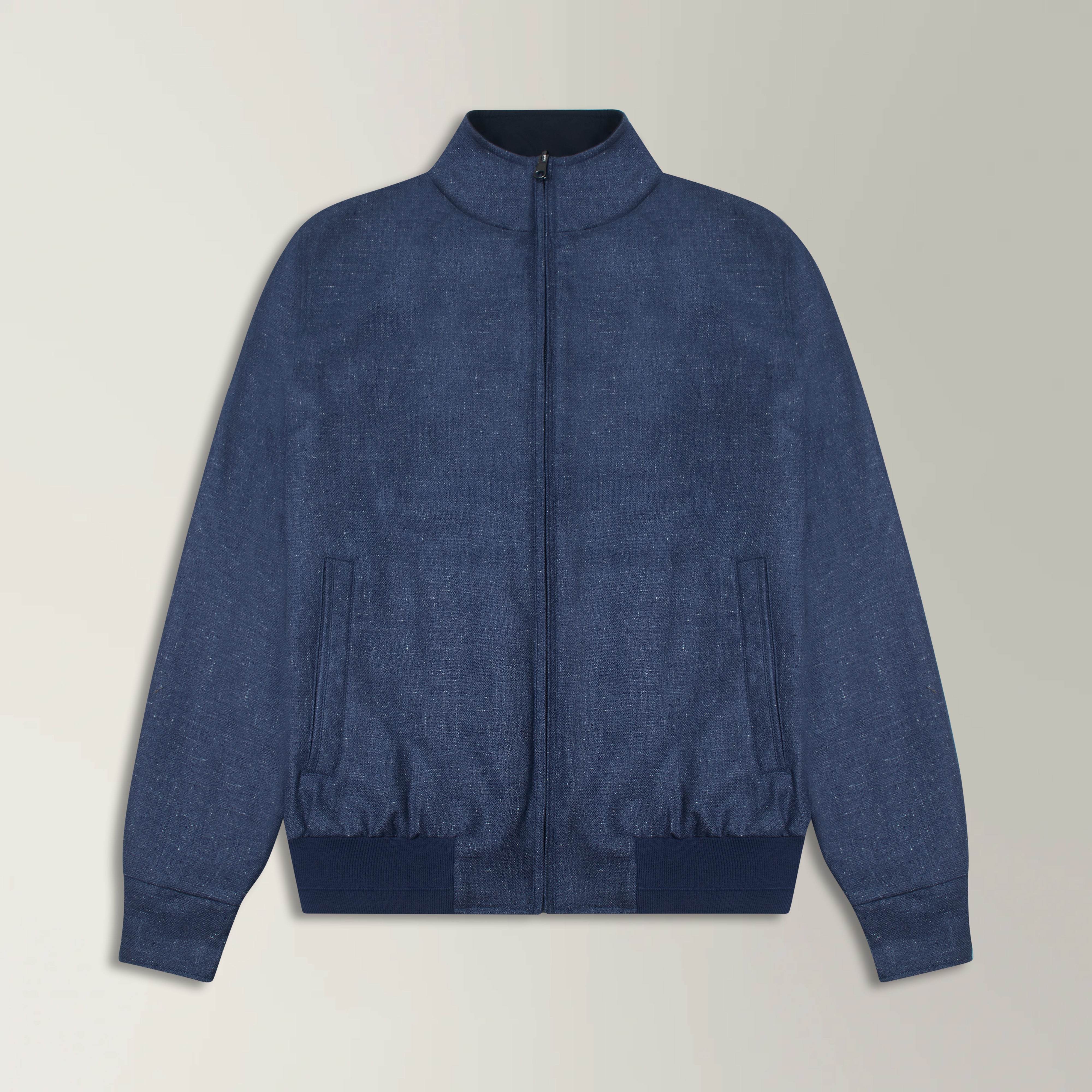 The Reversible Bomber Jacket in blue and navy is crafted in Italy from a blend of silk, lana wool, and polyester, combining refined surface texture with structural integrity. Fully reversible, the construction delivers two distinct tonal expressions within a single, defined silhouette.