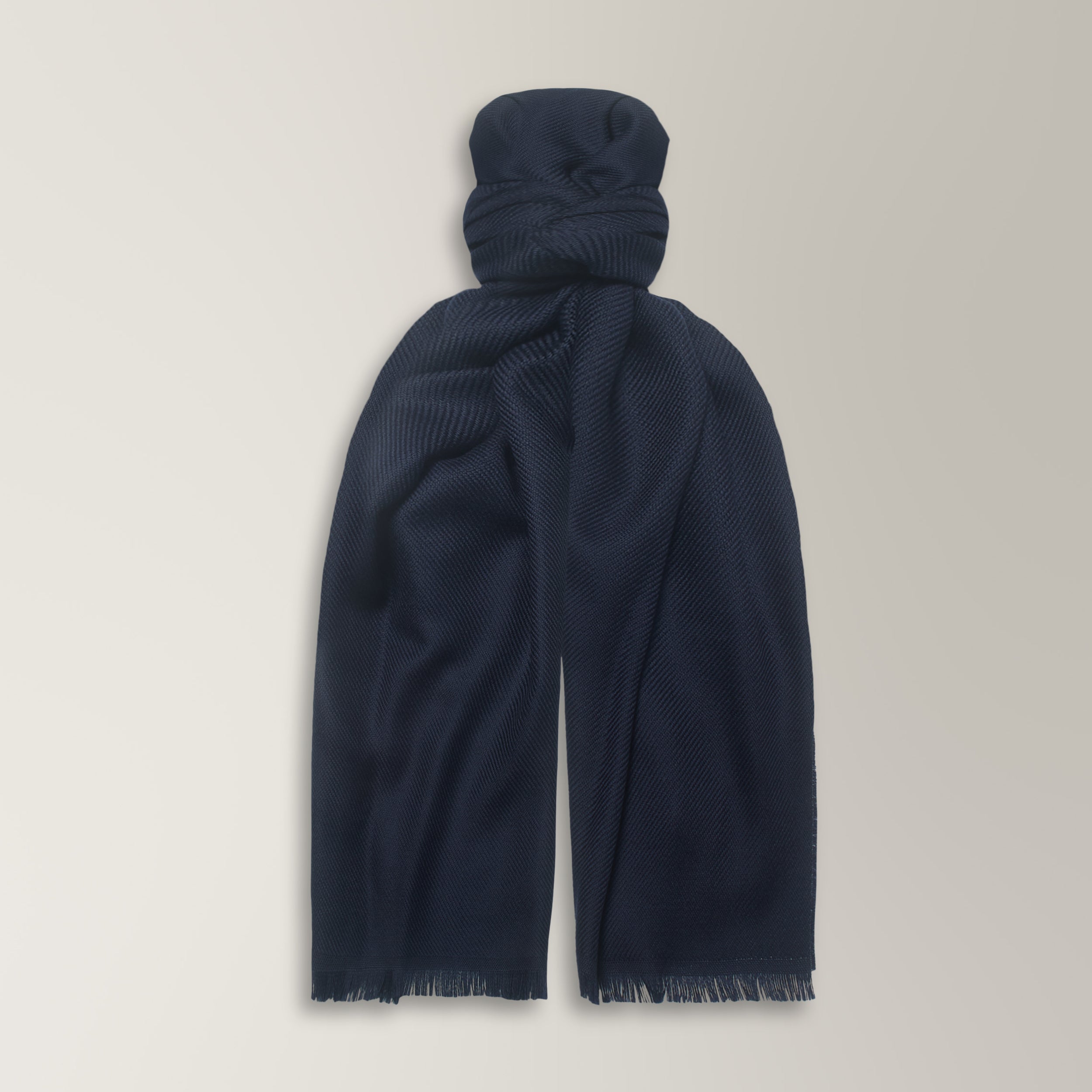 Made in Italy from 100% wool, this navy wool scarf offers a refined balance of warmth and lightweight comfort. Designed with a solid weave and finished with softly fringed edges, it brings subtle texture and timeless versatility to seasonal dressing. An effortless accessory that pairs seamlessly with both tailored outerwear and casual layers.