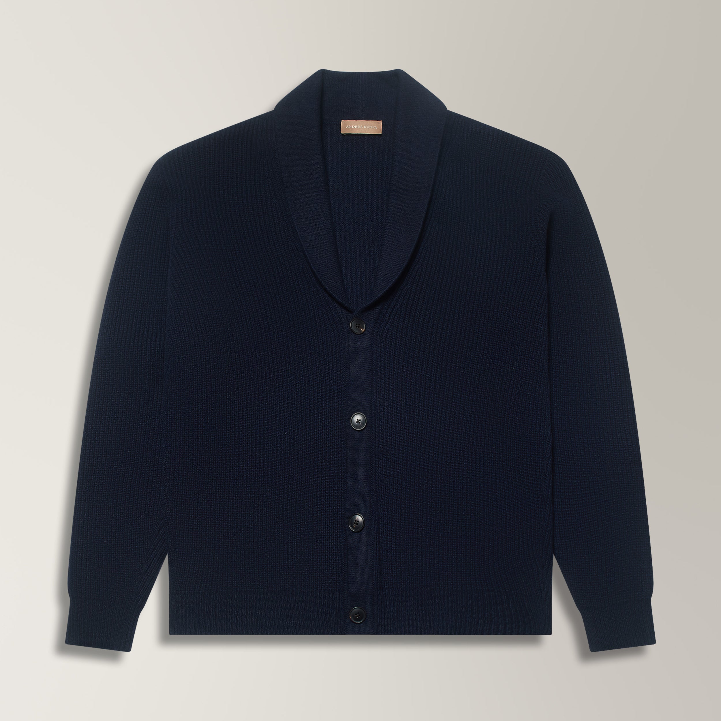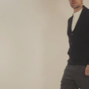 Made in Italy from a luxurious wool and cashmere blend, this midnight blue cardigan is a timeless knitwear staple. The ribbed construction adds texture and structure, while the shawl collar brings a relaxed yet elegant drape. Finished with a four-horn button closure and fine ribbing at the hem and cuffs, it’s a versatile layer designed for effortless pairing with both tailored and casual pieces.
