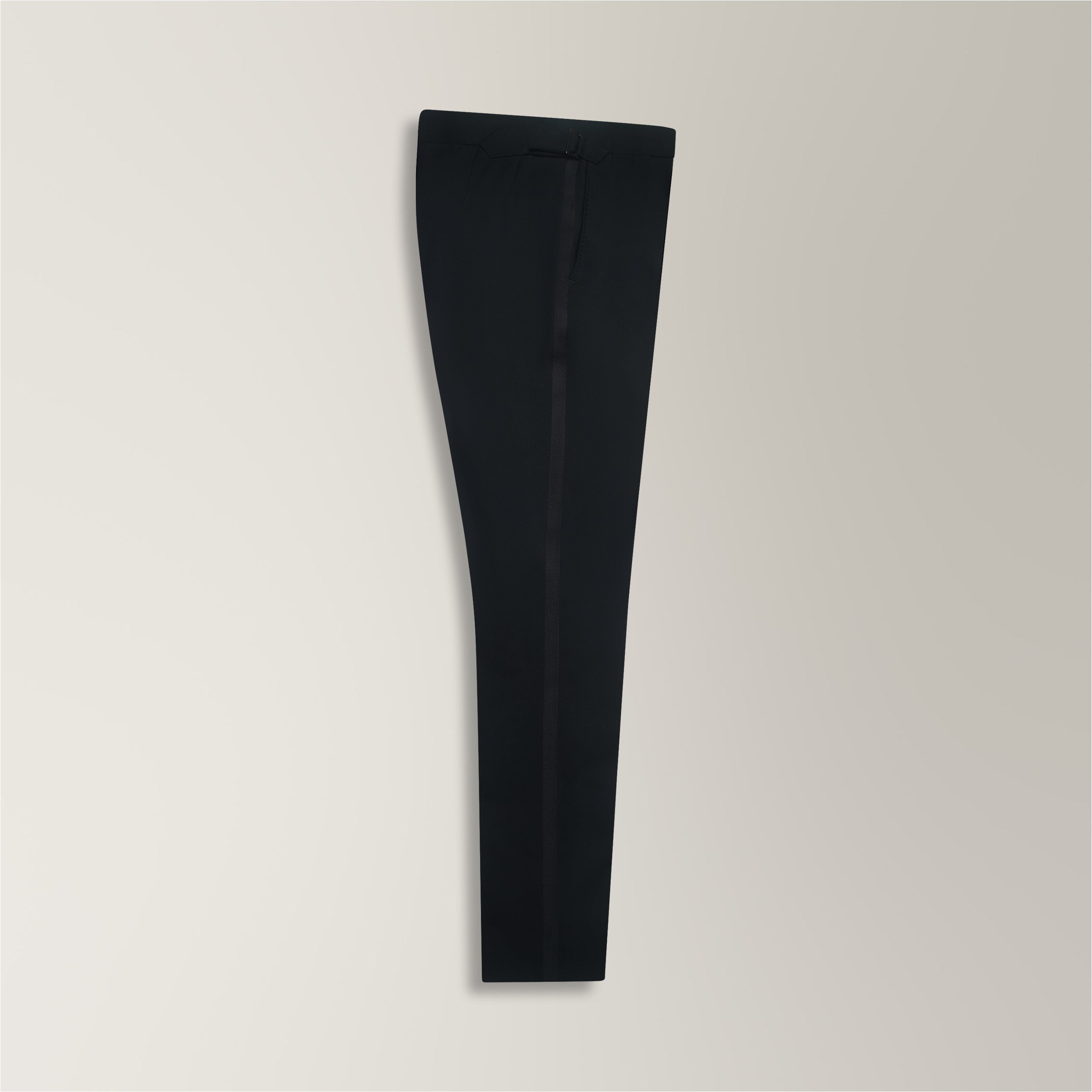 Tailored from a luxurious wool and mohair blend by Vitale Barberis Canonico, our tux trousers in black are designed for timeless elegance and a precise, streamlined fit. Featuring side adjusters, slanted side pockets, and a double hook-and-eye zip closure, they offer both comfort and clean structure. The black ottoman tape running along the leg adds a refined formal accent, while the absence of back pockets maintains a sleek silhouette. A classic tuxedo trouser, perfect for pairing with a matching dinner.