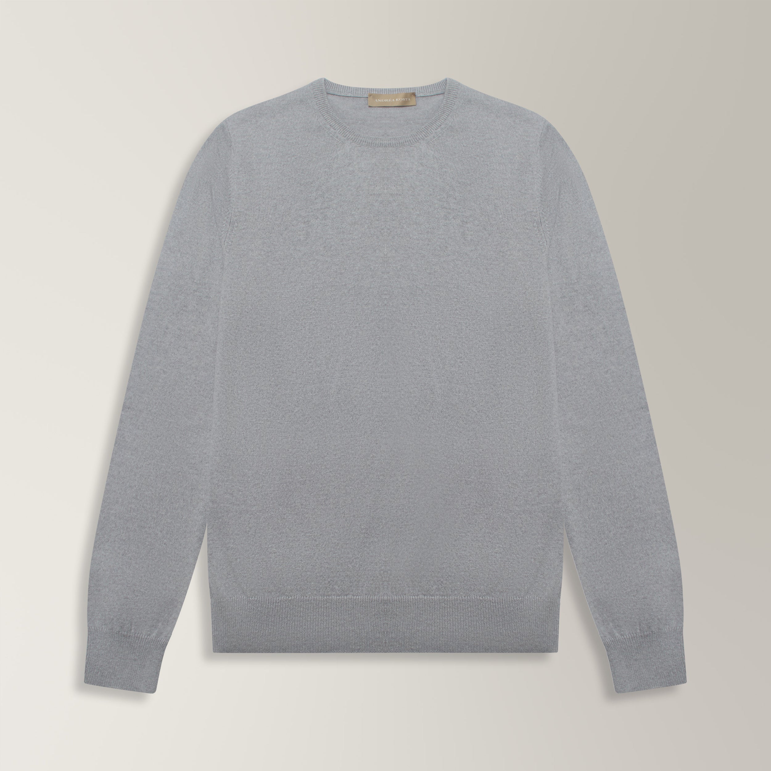 Light grey wool and cashmere jumper made in Italy, a wardrobe staple that combines the resilience of wool with the indulgent feel of cashmere, ensuring both durability and comfort. The fine ribbed collar, cuffs, and waistband add a touch of subtle sophistication, making it ideal for layering with tailored trousers or casual jeans.